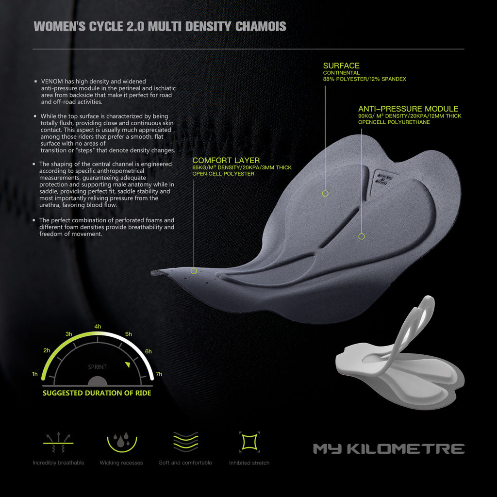 ➍【MK WOMEN'S CYCLE 2.0 MULTI DENSITY CHAMOIS】While the top surface is characterized by being totally flush, providing close and continuous skin contact. The "pelvic tract" area was tested and engineered to support the rotation of the pelvic bone on the saddle while pedaling. The ultra-high density insert makes this product ideal for 6-plushour rides.